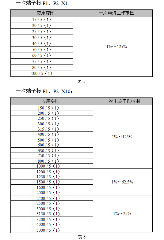 受内置升流器容量的限制,在较大变比下(如1200A以上的变比),标准电流互感器所设计的工作电流范围上限值随变比增大而减少。用户无特殊订货要求时,出厂默认的应用变比如下(表中的“检定变比”主要用于对本装置的标准电流互感器单独检定时参考,一般用户不必关心):
